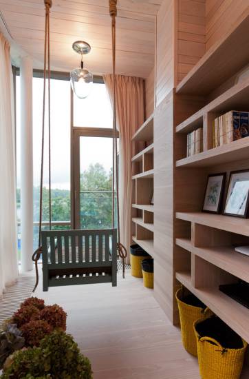 Застекленный балкон дает возможность не тратиться на закрытый со всех сторон шкаф. Для такого балкона идеально подойдет деревянный стеллаж. На полках стеллажа, кроме контейнеров с вещами, можно расставить цветы в горшках, декоративные лампы и сувениры, превратив утилитарное устройство в украшение балкона.