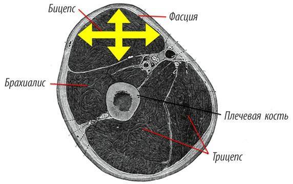 Растягивается фасция достаточно трудно, но она не может справиться с внутренним давлением, и начинает-таки растягиваться, позволяя увеличиваться в объеме (визуально и фактически) мышце, которую она окружает.