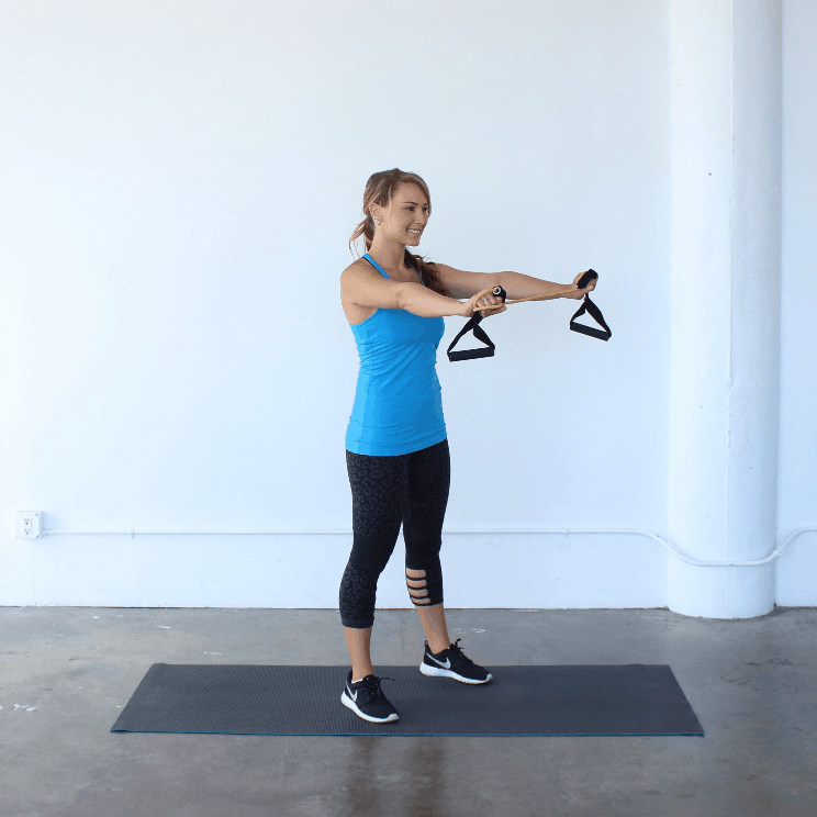 - Совершите 3 подхода по 15 подъемов с резиновыми петлями подходящей жесткости.