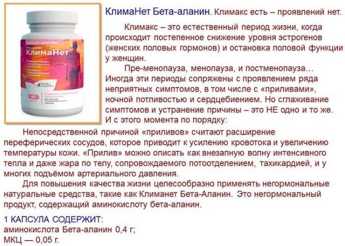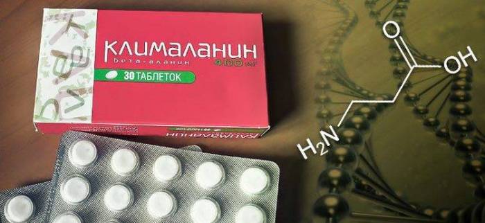 Фармацевтической компанией «Bouchara Recordati» (Италия) разработан препарат для лечения нейровегетативных проявлений менопаузы клималанин, содержащий β-аланин. β-аланин – неканоническая аминокислота, не включаемая в состав белков, синтезируется в организме человека. Он необходим для синтеза карнозина и пантотеновой кислоты, является агонистом глициновых рецепторов головного мозга. β-аланин противодействует высвобождению гистамина и брадикинина из тучных клеток, способствующих быстрому расширению сосудов кожи и покраснению в момент приливов (прямое стабилизирующее действие β-аланина на мембраны тучных клеток). Он не блокирует Н1-гистаминовые рецепторы. β-аланин необходим для синтеза пантотеновой кислоты (витамин В5) и ацилкоэнзима А – центрального кофермента метаболизма жиров, белков и углеводов. Ацилкоэнзим А жизненно необходим для синтеза основного субстрата энергетического метаболизма – аденозинтрифосфата. Стабилизация энергетического метаболизма способствует уменьшению вазомоторных пароксизмов и увеличению резервов адаптации к пониженному уровню эстрогенов .