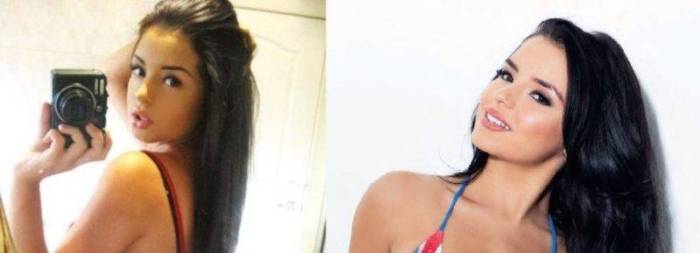 In the first photo Demi Rose Mawby has little but solid boobs with the shape and size reminding of coconuts. Whereas in the second photo that was taken some time after the first one, her mammary glands have mystically enlarged to the size of melons!