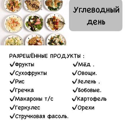 1-й – углеводный, нужно употреблять сложные углеводы + овощи – фрукты, этот день дает «встряску метаболизма» (3 грамма углеводов на 1 кг желаемого веса);
