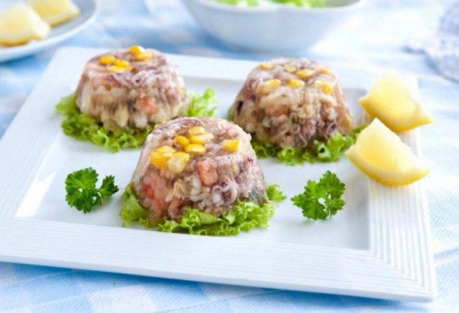 - Морепродукты поместить в тарелки и вылить в них бульон. Убрать в холод до полного застывания.