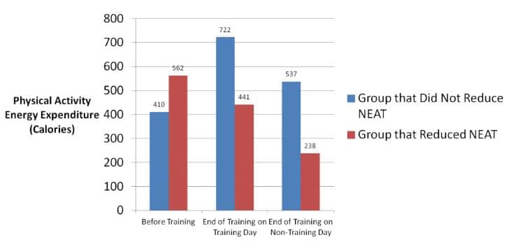 Ученые наблюдали 34 женщины, которые занимались на протяжении 13 недель (). Одни женщины после тренировки были активны и тратили много калорий за пределами спортзала. Другие, наоборот, компенсировали потраченные на тренировке калории, снизив уровень активности в течение дня после. Вероятно, кардио сделало их настолько уставшими, что сил поддерживать привычный активный образ жизни не было. Или, может быть, они думали, что раз уж потренировались, имеют право сидеть весь день.