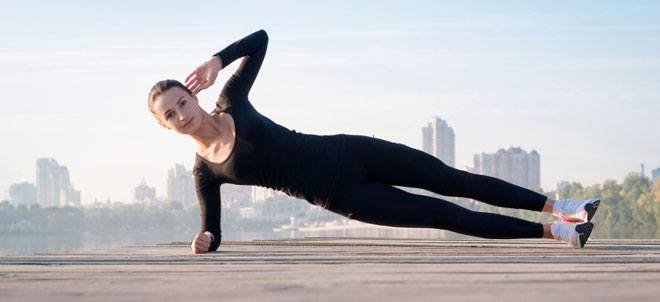 Как выполнять: Лягте на бок, правое предплечье на полу, локоть под плечом, а правое бедро на полу, колени согнуты. Напрягите боковые мышцы живота и поднимите бедра вверх, удерживая плечо над предплечьем и таз над полом. Чтобы усложнить упражнение, выпрямите ноги. Задержитесь в этом положении, вдыхая через нос и выдыхая через рот, напрягая мышцы живота и поднимая свободную руку вверх. Выполните то же самое на левом боку.