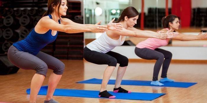 - Как выполнять – приседайте на вдохе, отводя таз назад до тех пор, пока колени не образуют угол в 90 градусов; на выдохе возвратитесь к исходному положению.