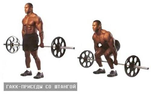 - делаются гакк приседания со штангой до такого положения, пока бедра и голени не образуют прямой угол.