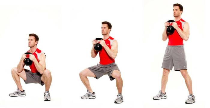 Упражнение на проработку внутренней части бедра. Удерживая гирю перед грудью, встаньте и поставьте ноги шире плеч. Отведите бедра назад, а затем вниз, как будто опускаясь на стул. Сожмите ягодицы в нижней точке и встаньте.