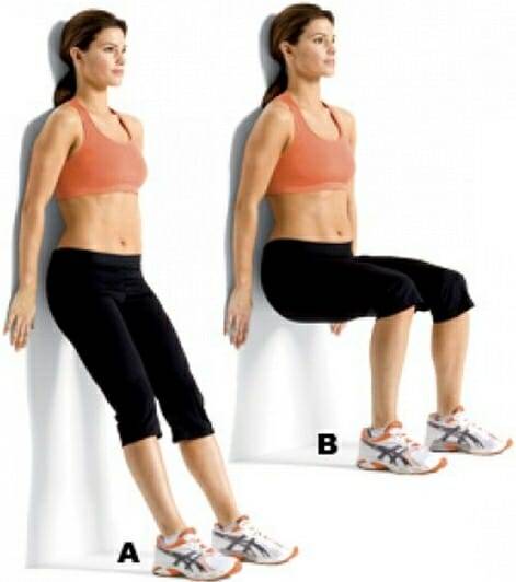 Прижмитесь спиной к стене и медленно опуститесь, будто садясь на стул. Оставайтесь в таком положении на протяжении минуты и выпрямитесь. Удерживайте ноги под прямым углом.