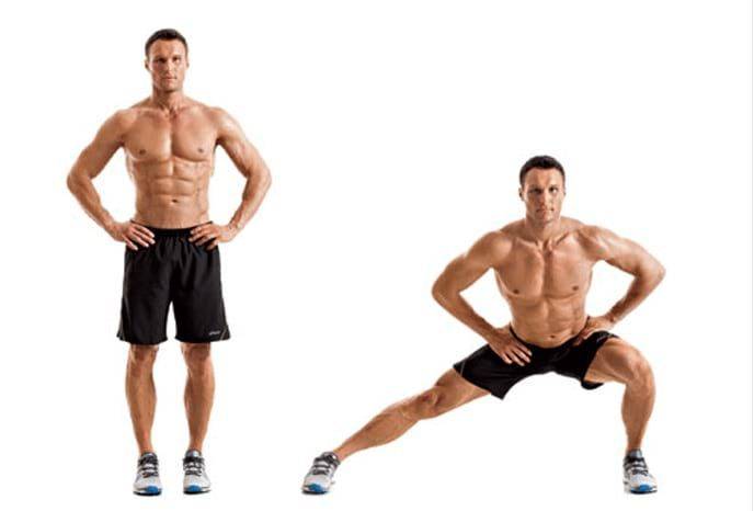 2. Боковые выпады. Упражнение, аналогичное предыдущему, с той разницей, что выпады будут в сторону. Делаем как можно