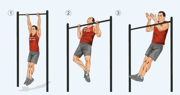 Взяться за перекладину, руки на расстоянии кулака друг от друга, большие пальцы закрыты в «замок». Подтянуться вверх и коснуться турника нижней частью груди. При прямом хвате основная нагрузка идет на бицепс, при обратном – на мышцы предплечья.