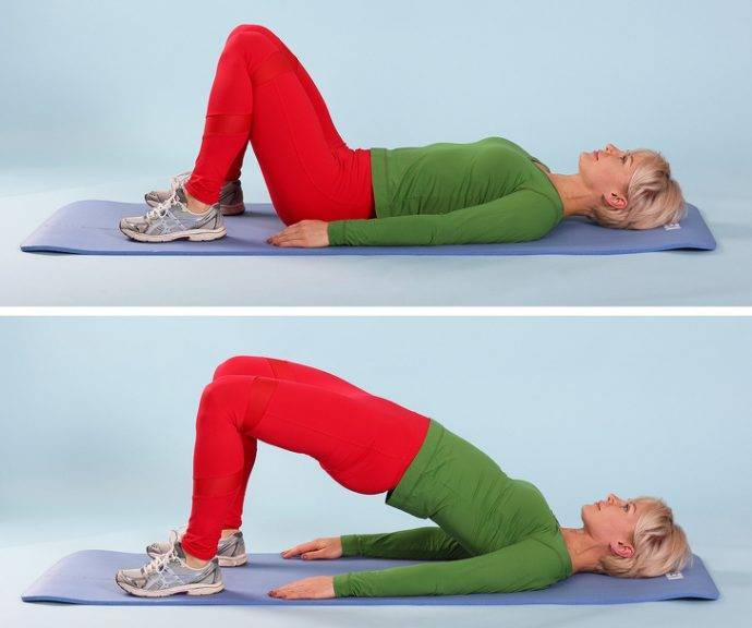 - На выдохе произвести поднятие таза вверх — в конечной верхней точке между голенью и бедром должен возникнуть прямой угол.