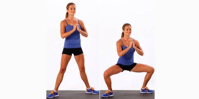 Простые или легкие приседанияИсходная позиция – ноги на ширине плеч, спина ровная. Начинаем упражнение и отводим попу назад, корпус держим ровно, для противовеса руки выставляем вперед. Такие приседания называют в стиле сумо. Нагрузка идет на пятки, носки разворачиваем на 45°. Делаем медленно и не забываем правильно дышать: опускаемся на вдохе, подъем делаем на выдохе. Постепенно можно вводить вес в виде гантелей или гири. Увеличивайте нагрузку и совершенствуйте технику выполнения. Делаем 15-20 приседаний (3-4 подхода).