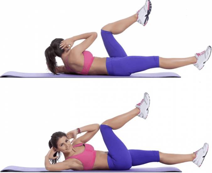 Это упражнение помогает получить кубики на животе девушке, прорабатывая косые и боковые мышцы живота. Нужно лечь на пол, корпус немного приподнять. Руки положить вдоль туловища, ноги поставить на пол, согнув их в коленях. Теперь по очереди дотрагивайтесь левой рукой до пятки левой ноги, и правой рукой до пятки правой воды. Не тяните руки к ногам – двигайтесь только корпусом.