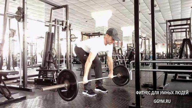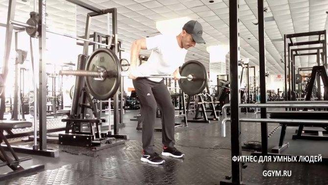 - И.п. – ноги на ширине плеч. Штангу возьмите широким верхним хватом.