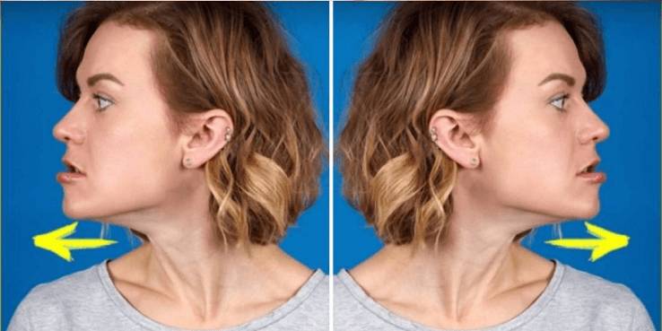 - Голову максимально запрокинуть назад, а подбородок выдвинуть вперед. Нужно выдвигать нижнюю челюсть. При этом, стараться захватить нижней губой верхнюю губу.