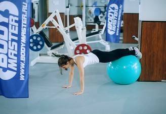 Отжимания с ногами на фитболе. Лягте лицом вниз, удерживайте тело на весу на вытянутых руках, ноги на фитболе. Опускайтесь, пока грудь почти не коснется пола. Мышцами груди поднимите верхнюю часть тела.