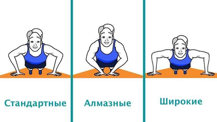 Постановка рук шире плеч, увеличивает нагрузку на наружные грудные и дельтовидные мышцы. Уменьшения расстояния между руками акцентирует нагрузку на трицепсе и внутренних грудных мышцах.
