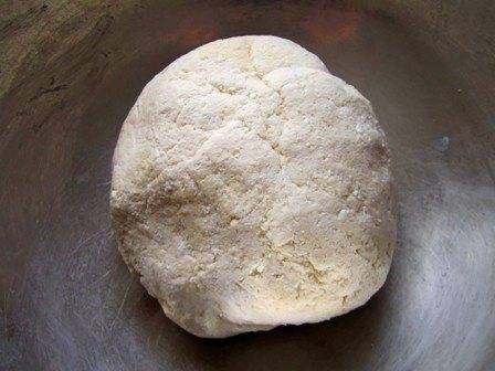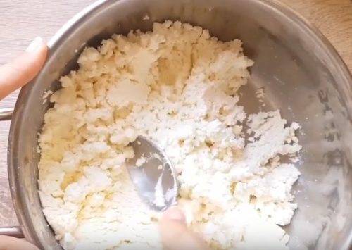 1. Творог разминаем в миске, добавляем просеянную муку, соль и сахар. Месим тесто.