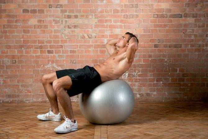 - Скручивания на фитболе. С помощью тренировочного мяча можно проработать пресс под необычными углами. Человек ложится на фитбол спиной и тазом, опираясь ступнями в пол. Руки можно закинуть за голову или положить на грудь. Надо поднять корпус так, чтобы поясница не отрывалась от мяча, и затем опуститься, вернувшись в изначальное положение.