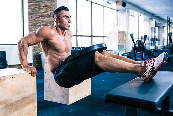 Исходная позиция – пятки касаются пола, руки на скамье за спиной. Медленно опустите туловище вниз, задержитесь в нижней точке, затем взрывным усилием вытолкните вес тела вверх над скамьей. Локти направлены назад. Для усложнения используйте дополнительную нагрузку, положив вес на бедра.