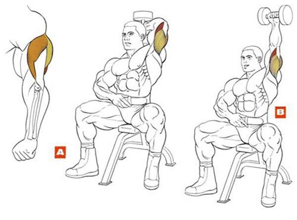 В положении сидя, есть одно эффективнейшее упражнение для трицепсов, для которого понадобится одна гантеля. Выполнение: