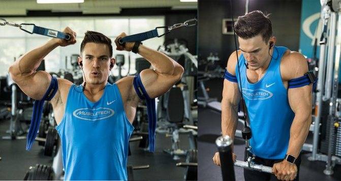 Суперсет – это когда за один подход спортсмен выполняет два разных упражнения, не делая между блоками перерыва. Например, прокачали трицепс и тут же без паузы начинают заниматься бицепсом. Можно также делать разные упражнения, тренирующие только трехглавую мышцу (отжимание плюс разгибание рук на тренажере).