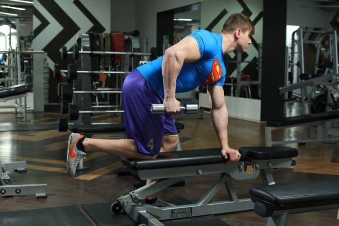 Обопритесь на скамью рукой и коленом, выпрямите спину и возьмите гантель в свободную руку. Она должна свободно свисать с боковой стороны скамьи. Согните руку в локте. Далее: