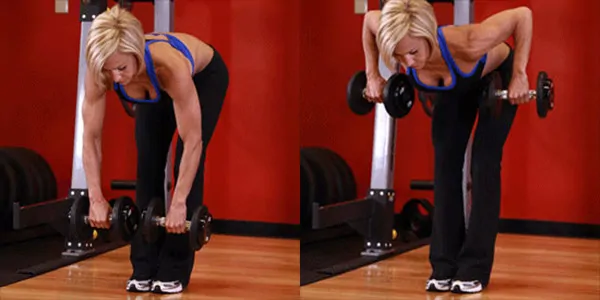 - Исходное положение — гантели опущены, корпус наклонен вперед, чтобы сместить акцент нагрузки именно на задние пучки.