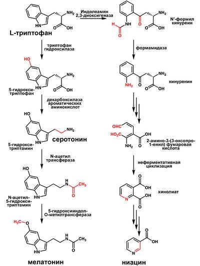 Синтез мелатонина (а также серотонина, ниацина) из триптофана