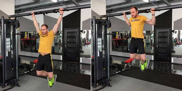 Есть еще одно полезное движение. Для его выполнения вы должны запрыгнуть на спортивный снаряд, а также согнуть ноги в коленном суставе. Тип хвата – прямой. Во время опускания туловища атлету необходимо сделать небольшой прогиб в позвоночнике. Во время движения сведите лопатки. Количество повторений полостью зависит от индивидуальных способностей каждого спортсмена. Постепенно увеличивайте количество повторений и подходов. Первые результаты вы сможете заметить уже через месяц.