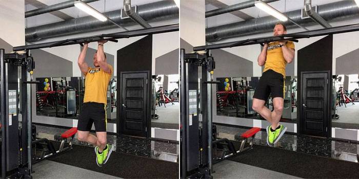 - Нужно повиснуть на перекладине, расположив ладони обратным хватом на расстоянии 10-15 сантиметров друг от друга. Корпус напряжен, ноги согнуты, чтобы не раскачиваться на перекладине.