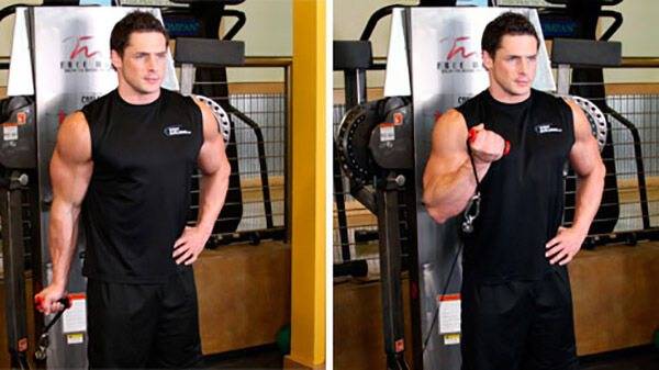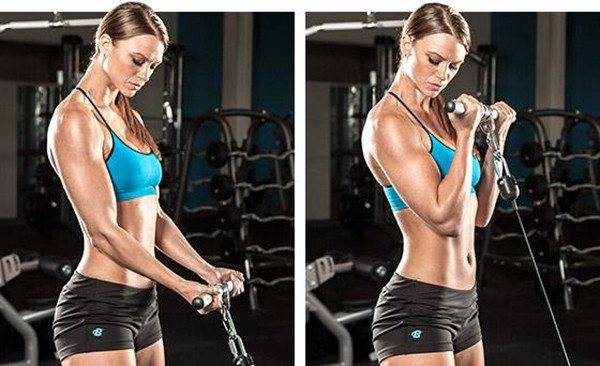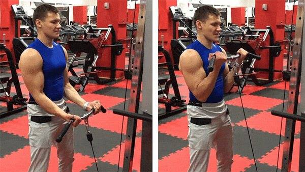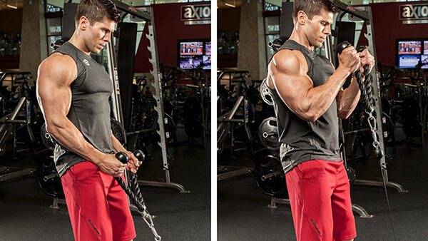- Максимально напрягите бицепс и потяните ручки тросов к себе так, чтобы ваши кисти оказались на уровне висков. Можно при этом слегка согнуть запястья. В финальной точке задержитесь на 1-2 секунды и медленно подконтрольно вернитесь в исходное положение.