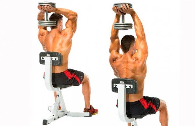 Французский жим стоя или сидя можно исполнять с одной гантелей. Вся нагрузка ложится на длинный пучок в этом случае. Возьмитесь обеими руками за гантель, руки заведите за голову. Необходимо поднимать руки с гантелью вверх, затем медленно опускать вниз.