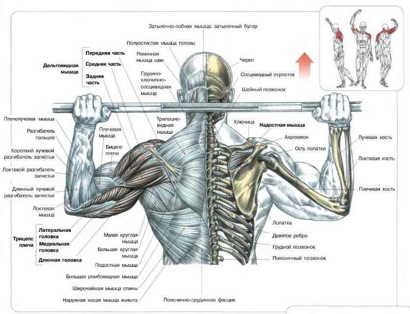 Основную работу выполняет средний пучок дельтовидных мышц. Именно эта область отвечает за подъемы рук вверх. Благодаря тому, что гриф штанги удерживается в положении за головой, и следует исходя из этой траектории, дополнительно нагрузку получают передние пучки дельт. Они ответственны за удержание рук в правильном положении и не дают им уводиться назад.
