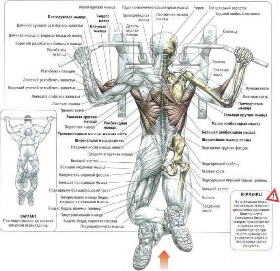 - Максимально вовлекают мышцы спины и, в меньшей степени, мышцы рук.