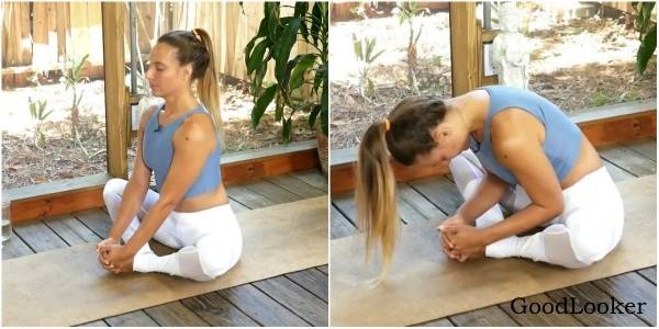 - Необходимо сесть на пол, раздвинуть ноги и медленно опускать голову, прижимая подбородок к ключице. В это время руками следует тянуться вперед, опираясь ими на пол. Благодаря таким манипуляциям растягивается позвоночник.