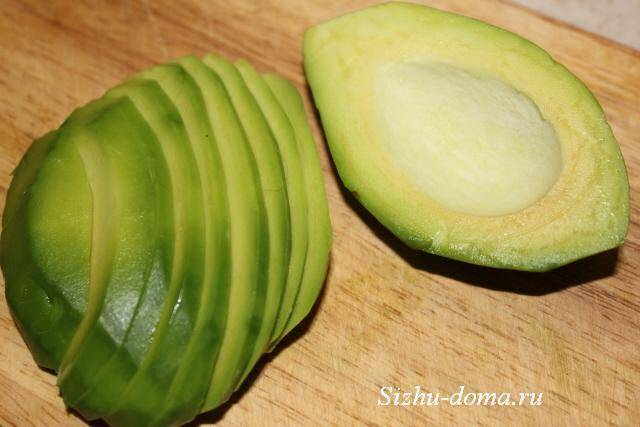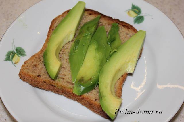 Очищаем авокадо от кожуры, извлекаем из плода косточку, половинки плода режем дольками. После этого необходимо выложить дольки на кусок хлеба. Если плод очень мягкий, его можно размазать по хлебу, как сливочное масло.