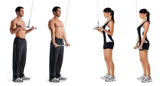 Разгибания рук на верхнем блоке – более легкая версия упражнения, которая отлично подходит для начинающих спортсменов.
