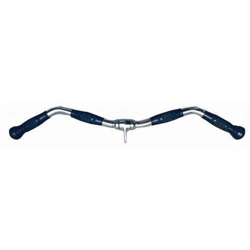 Работа изогнутой рукоятью позволяет расположить кисти особым образом: правую — по часовой стрелке, а левую — в противоположном направлении. В этом случае акцент нагрузки сместится на внешний пучок трицепса. Кроме того, изгибы на ручке создают более комфортную позицию для локтей и снижают нагрузку на эту зону.