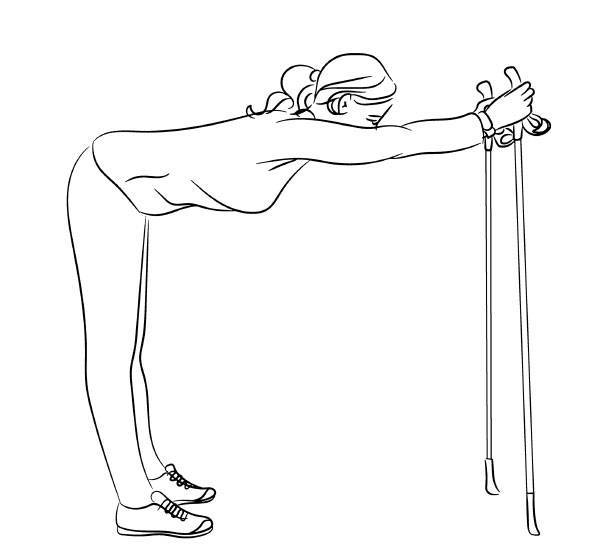 Упражнение 7. Обе палки для ходьбы в руках. Делаем наклон вперед и упираемся на палки прямыми вытянутыми руками. Пять раз прогибаемся.