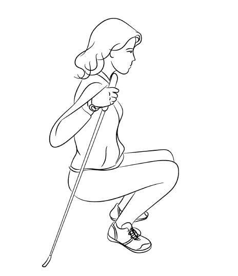 Упражнение 3. Берем в руки палки для ходьбы. Слегка отводим руки назад, чтобы концы упирались чуть сзади. С упором на палки совершаем приседания. Рекомендуется выполнять не менее 15. Новичкам следует начинать с 3–4 приседаний, а затем постепенно увеличивать количество.