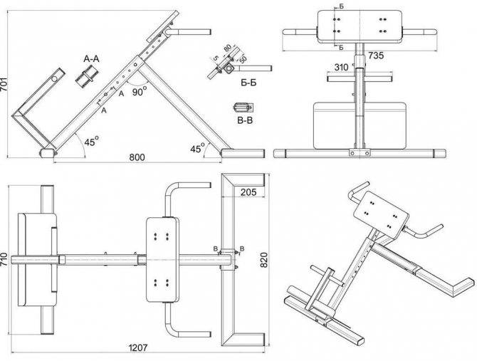 Стандартными являются длина тренажёра в 1100 мм, ширина 500 мм и высота в верхнем положении скамьи 700 мм. Расстояние от пола до валика должно быть около 400 мм.