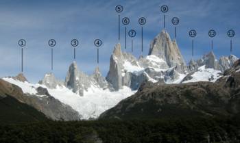 East face of the Fitz Roy group showing Poincenot (5) and Mermoz (12).