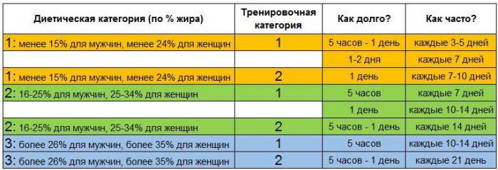 Может показаться нелогичным: чем стройнее становится человек, тем больше и чаще нужно делать углеводные загрузки (что видно из таблицы). Дело в том, что чем ниже процент жира, тем ощутимее замедление обмена веществ на диете. Диета и низкий процент жира воспринимаются организмом как голодание, а углеводные загрузки — как раз способ это контролировать.