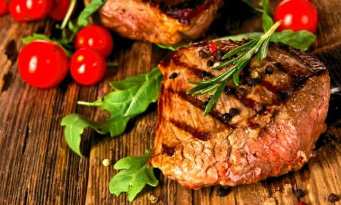 | Говядина (стейк) | 218 | 18,6 | 16,0 | — | |