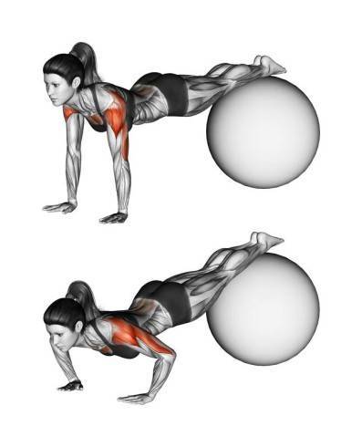 - Встаньте на ступни, поставьте мяч перед собой. Начинайте опираться на него руками, ноги отводите назад, держите ровную спину, не напрягайте шею. Упражнение рекомендуется повторять 45 раз.