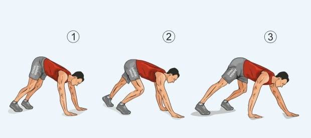 Важно! В исходном положении колени прямые и составляют с бедрами одну сплошную линию. Медвежью проходку рекомендуется выполнять по 30 шагов в одну сторону после каждого сделанного упражнения в программе для стимуляции сердечно-сосудистой системы