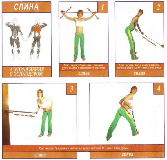 Тренинг с эспандером дома может включать следующие базовые упражнения:
