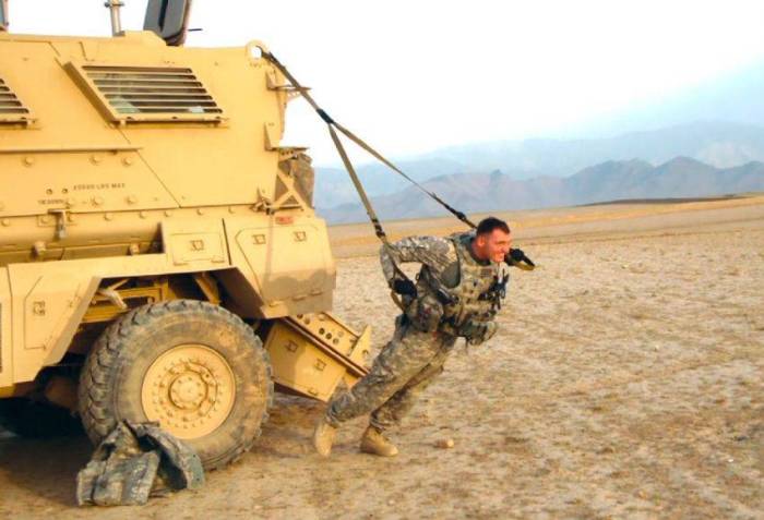 Сначала в ход пошел пояс от кимоно с одной петлей, а чуть позже спецназовец додумался приспособить ленту для починки парашютных строп. Из нее получилась Y-образная петля с ручками, с помощью которой Рэнди мог тренировать различные группы мышц.